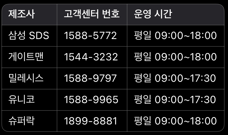 제조사별 대표 고객센터 연락처: