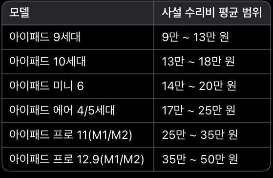 애플코리아에서 공개한 아이패드 디스플레이 수리 비용(보증 외 수리 기준)은 다음과 같습니다.